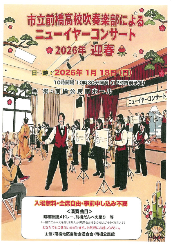 地元の南橘地区で勉学に励んでいる市立前橋高校吹奏楽部の皆さんによるニューイヤーコンサートが開催されます 音楽は耳で聞くと思われている方に、是非とも身体全体で素晴らしい音楽を体験して欲しいと思います。